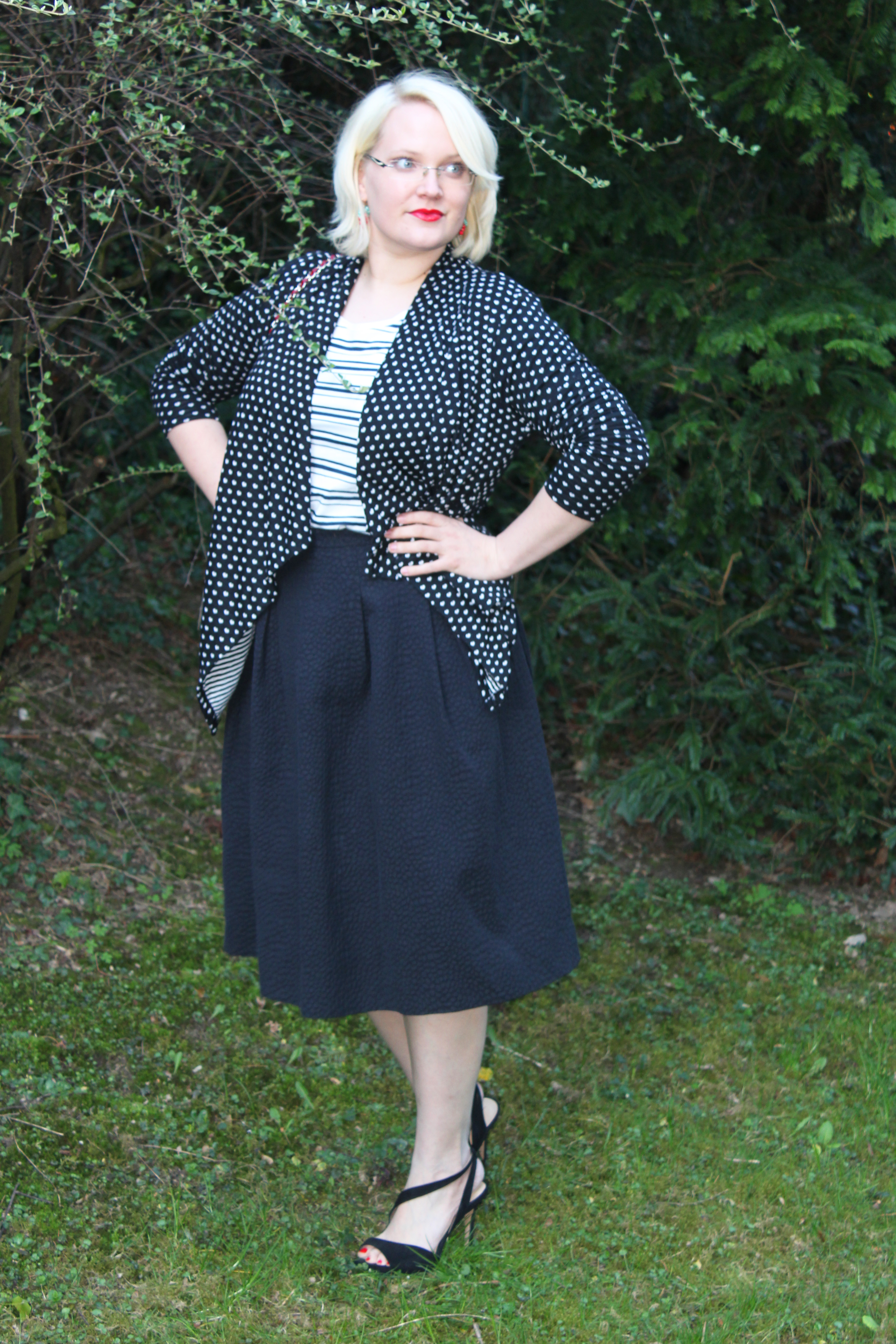 Meine Lieben, heute gibt es mal ein Outfit, das von den 50er Jahren inspiriert ist… Aktuell gibt es ja überall Midiröcke, die bis zur oberen Mitte der Wade gehen. Ein sehr hübscher und weiblicher Trend, wie ich finde. Auch der Mustermix ( Streifen / Punkte ) bleibt dieses Jahr ein großes Thema und ist sehr spannend, sollte aber in einer Farbfamilie bleiben, um nicht zu unruhig und unharmonisch zu wirken. Ich habe mich hier auf die Farben schwarz und weiß beschränkt und rot als Kontrast und Farbtupfer gewählt.