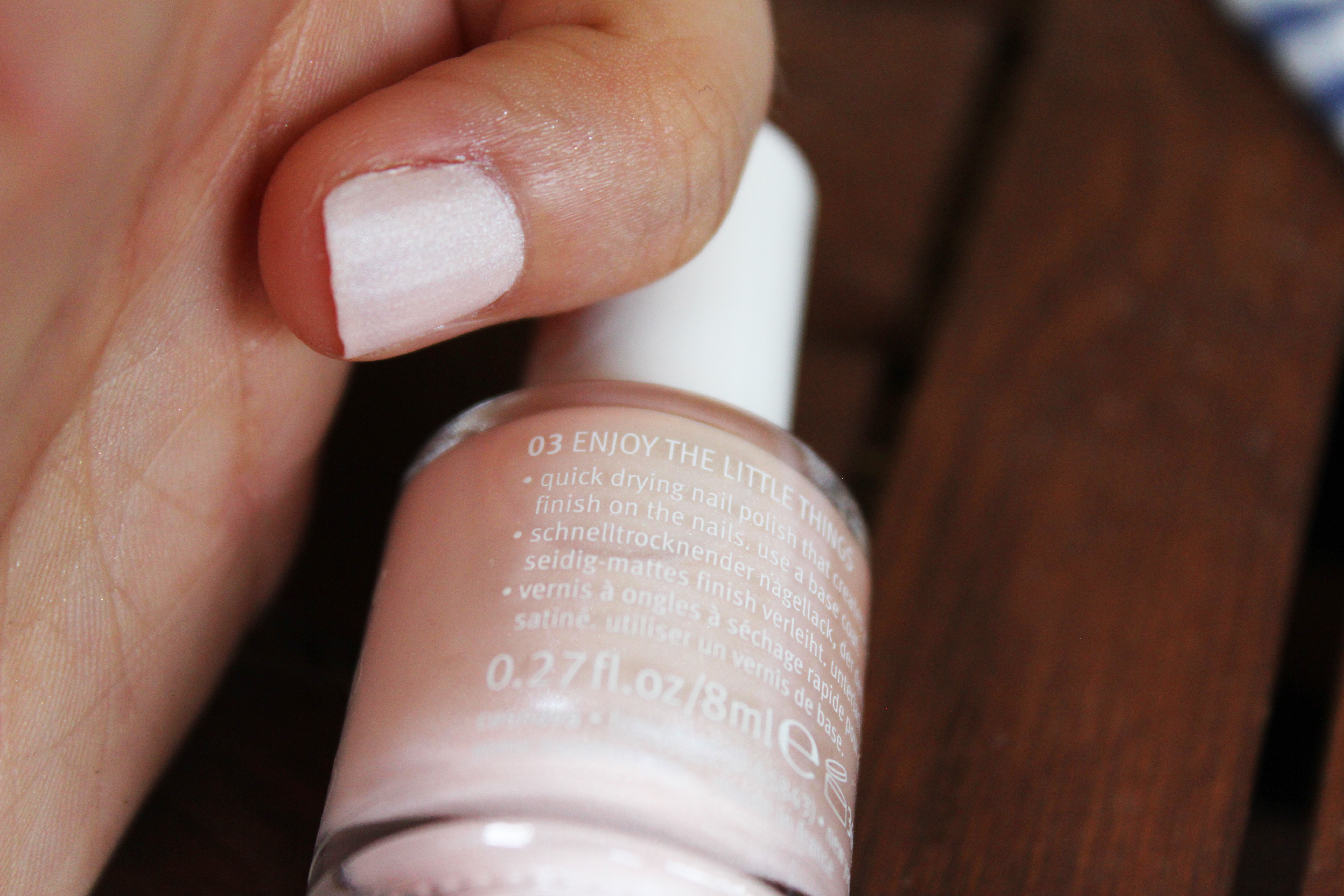 Die Limited Edition enthält u.a. 6 Nagellacke (2 matte Nagellacke, 4 glänzende Lacke mit verschiedenen Effekten), wovon ich vier testen durfte. Hier habe ich euch alle Lacke in 2 Schichten aufgetragen. Ich habe nach diesen Fotos zwei der Lacke (Just happy und Enjoy the little things) probeweise getragen und muss leider sagen, dass „Just happy“ bei mir ohne Überlack schon am ersten Tag gechippt hat, mit Überlack hielt er 4 Tage ohne einen Makel. Enjoy the little things (ein matter Lack) hielt ohne Überlack 2 Tage ohne zu chippen. Die wirklich schönen Pastelltöne finde ich allgemein wirklich sehr schön, allerdings hätte ich mir mit dem Ausblick auf den Herbst eine andere Farbrange gewünscht. Für den Alltag sind die Lacke aber wirklich sehr gut tragbar, weil sie durch ihre Pastellfarben gut zu kombinieren sind.