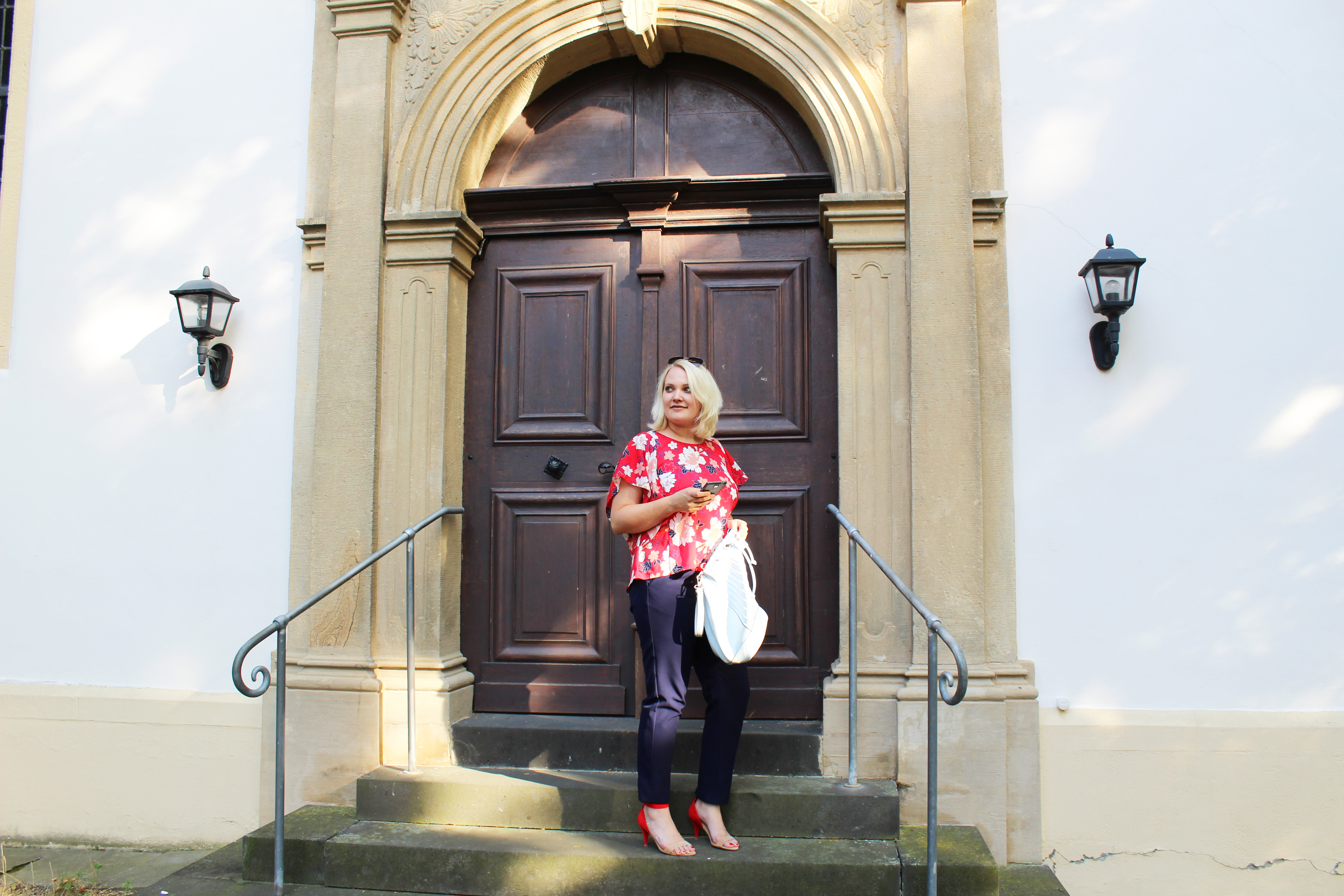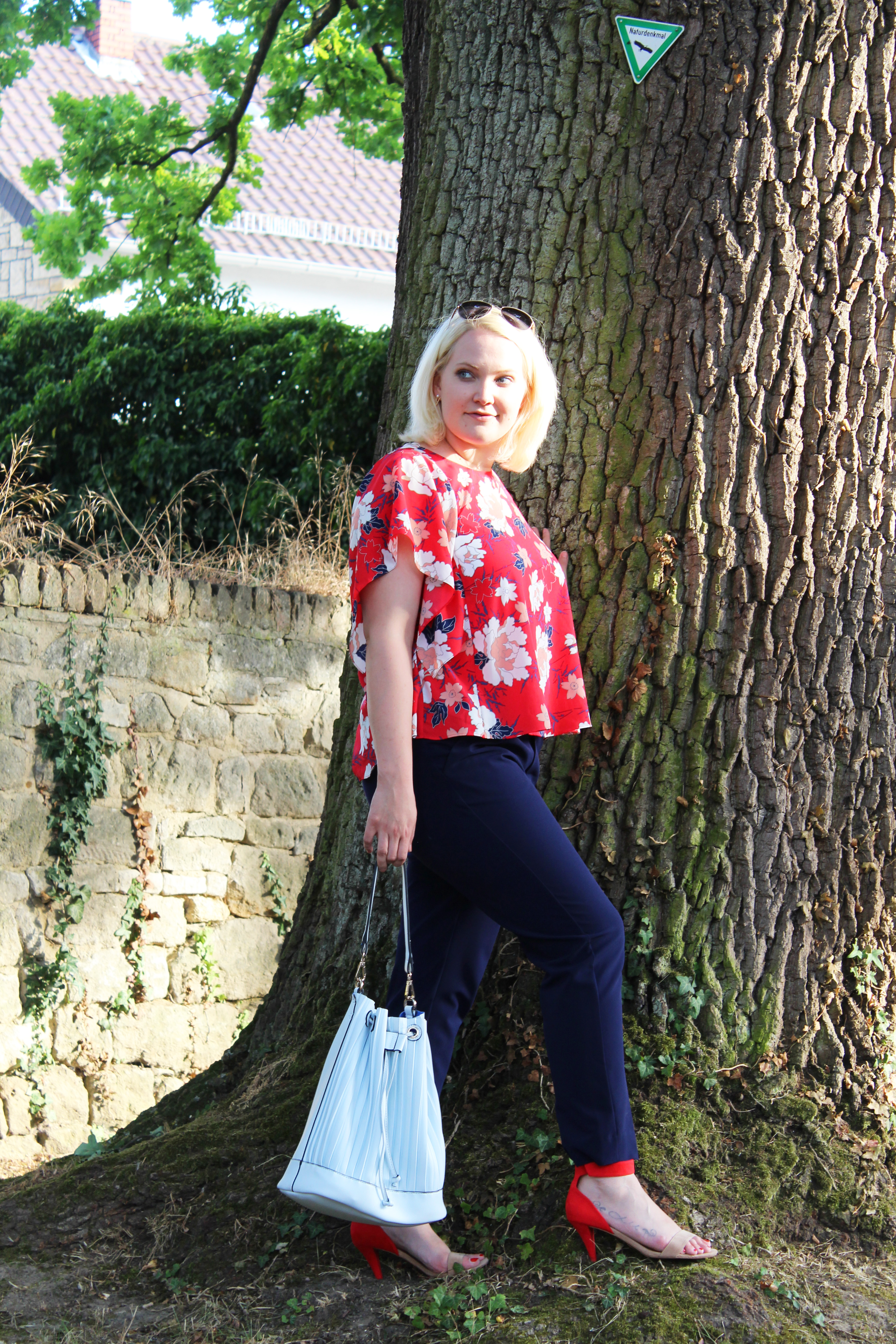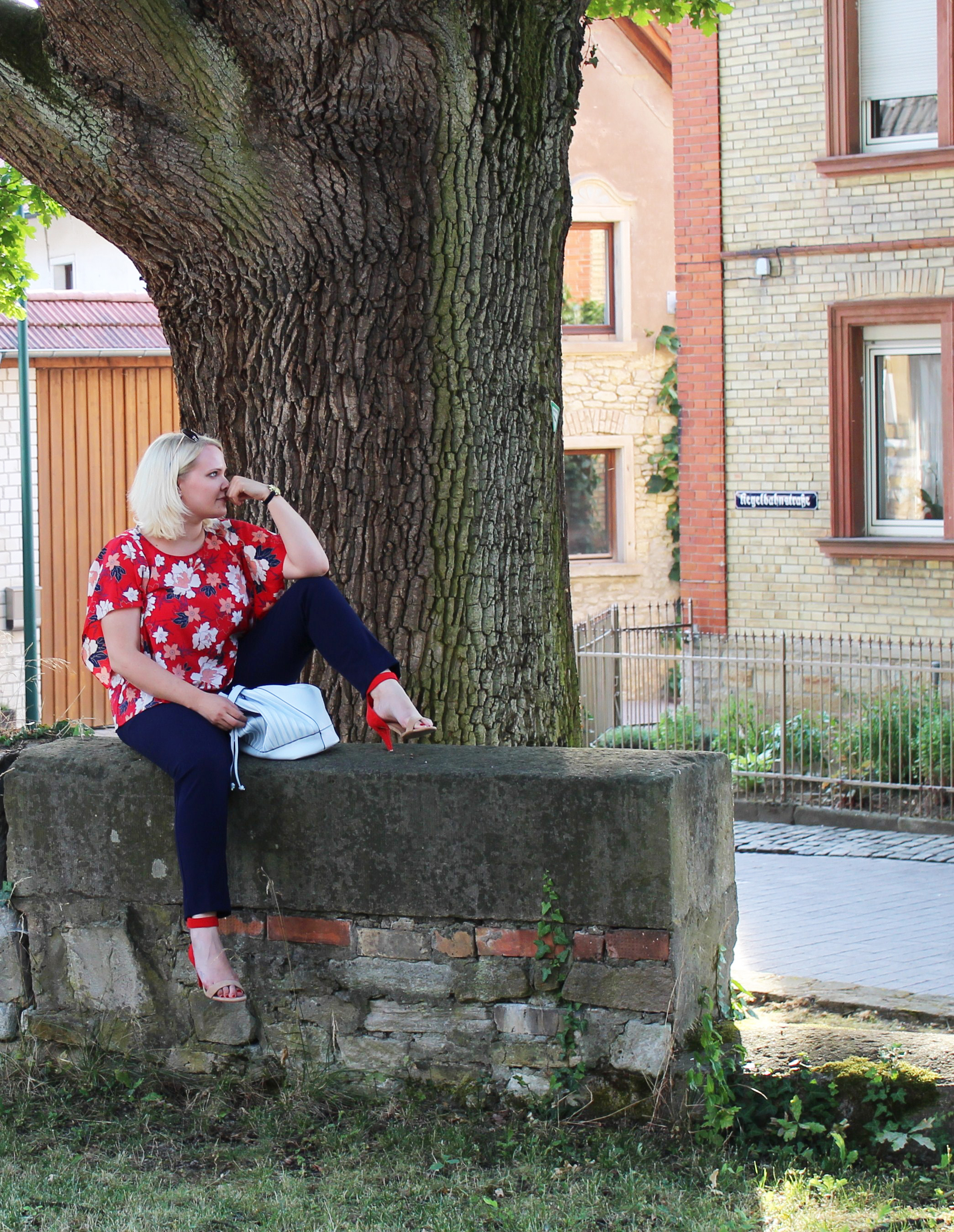 Das Oberteil von Zara ist eindeutig der Blickfang bei diesem Outfit. Zunächst fällt der Blick auf das schöne, fast asiatisch anmutende Blumenmuster, der Clou ist aber definitiv das asymmetrisch geschnittene, überkreuzte Rückenteil, das einen kleinen Blick auf den Rücken freilegt. Ein etwas anderer Rückenausschnitt und sehr angenehm luftig für warme Augusttage.